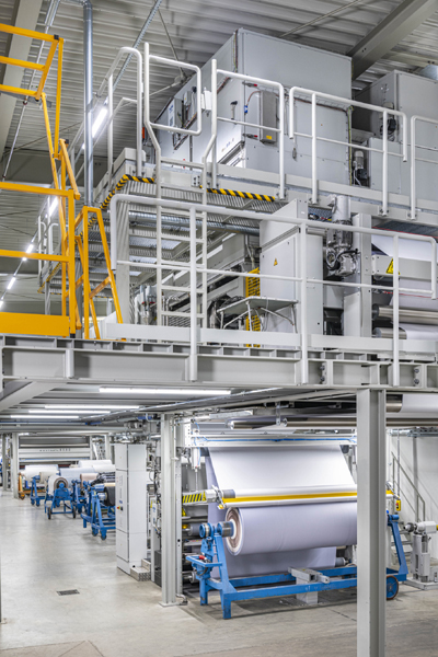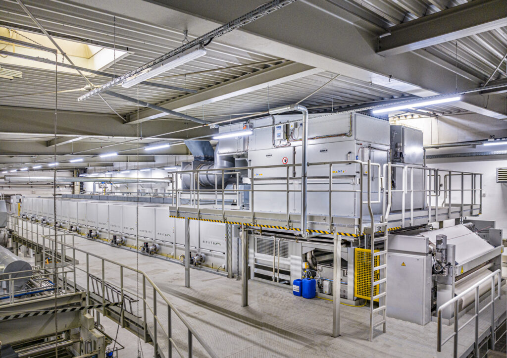 The special multi-level configuration that Monforts designers and Curt Bauer’s team devised in order to meet these requirements involved raising all of the line’s drying zones – with a combined length of over 28 metres – on scaffolding platforms, to enable the ground floor space below them to continue to be fully utilised.